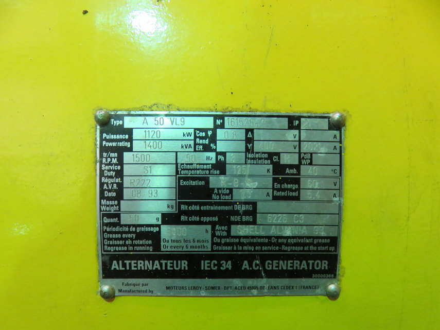 | Remarques | Power rating: 1120 kw; Power factor: 0.8 |